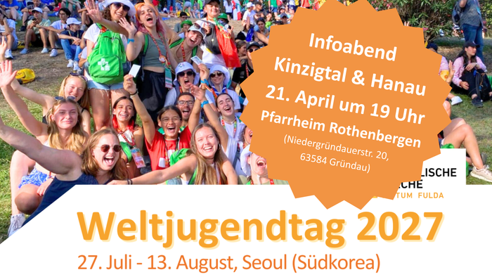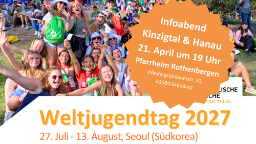 Am 27 Juli bis 13 August 2027 finden in Seoul (Südkorea) die Weltjugendtage statt. Zu diesem Anlass laden wir Sie im voraus herzlich zum Infoabend am 21. April um 19 Uhr im Pfarrheim Rothenbergen ein.
